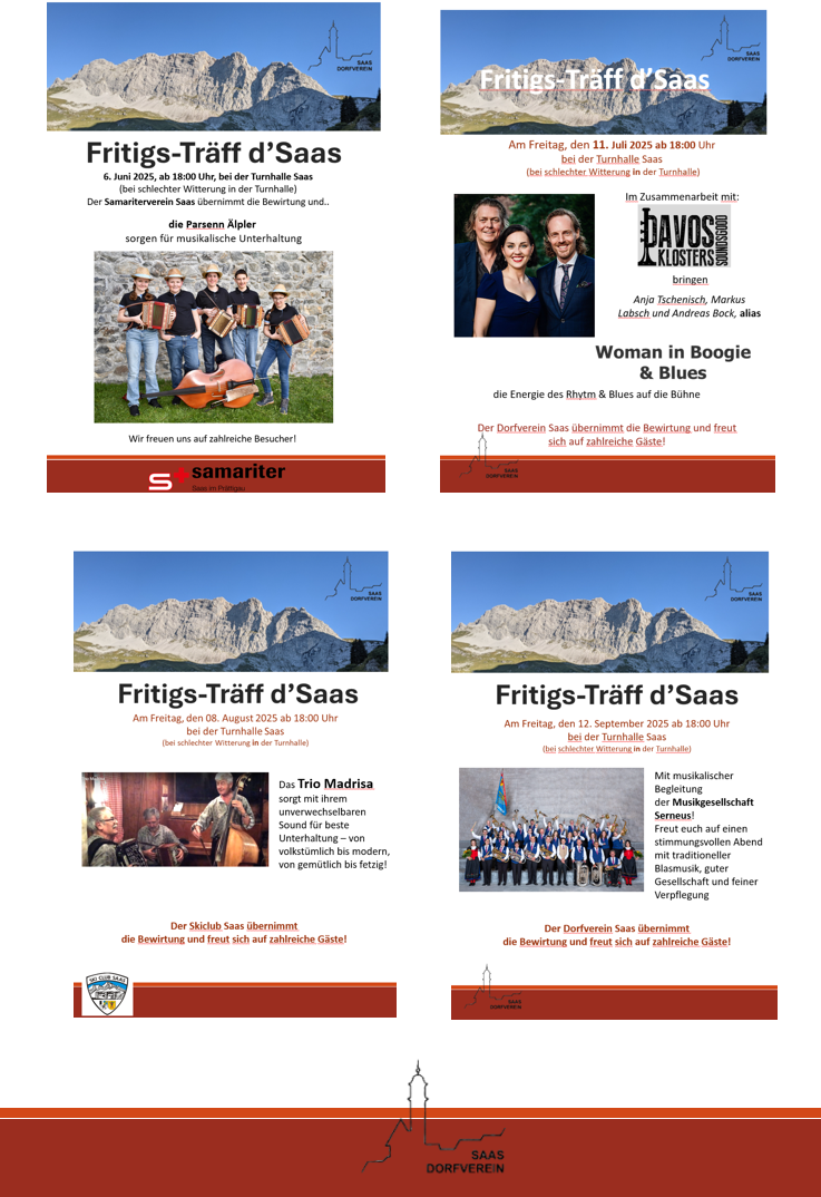 Der Dorfverein lädt Sie herzlich ein, gemeinsam mit anderen Saaser Vereinen den Fritigsträff zu erleben. Jeden ersten Freitag im Monat, von Juni bis September,